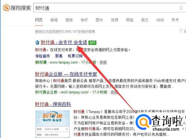 打开电脑,进入搜狗浏览器,搜索“财付通”,点击并进入,如图所示。