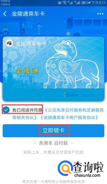 然后我们点击勾选 我已阅读并同意,之后我们点击立即领卡;