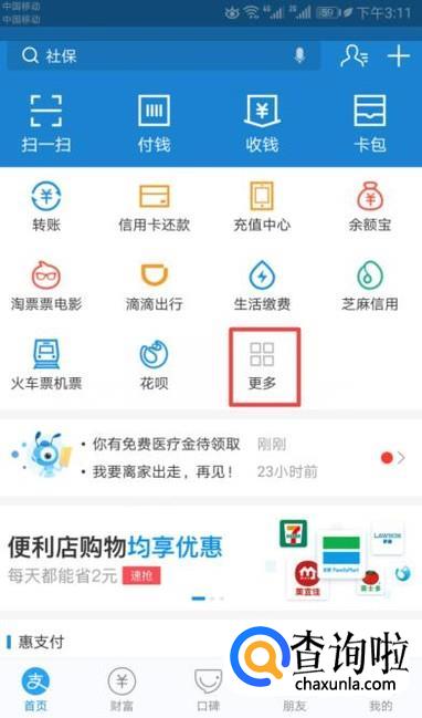 首先,我们打开我们手机上的支付宝,然后我们点击更多;
