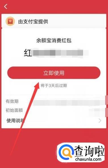 扫描之后,得到余额宝红包,点击立即使用,进入下一页面,如图所示。