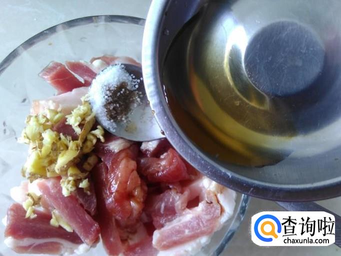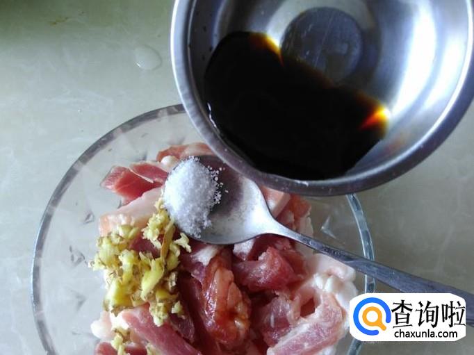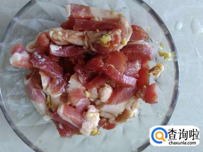 猪肉切成肉丝,加适量的盐、姜蓉、1勺生抽、