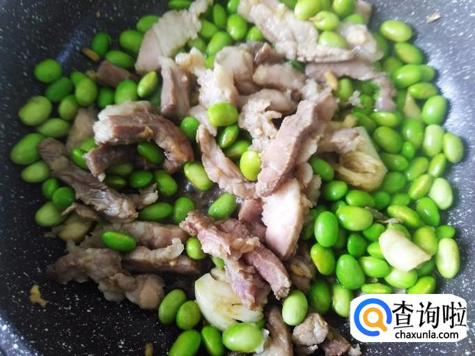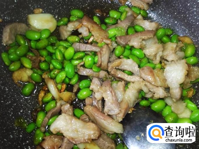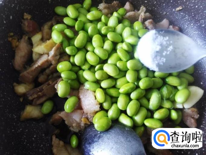 翻炒10秒左右,放青豆进去,加适量的盐。