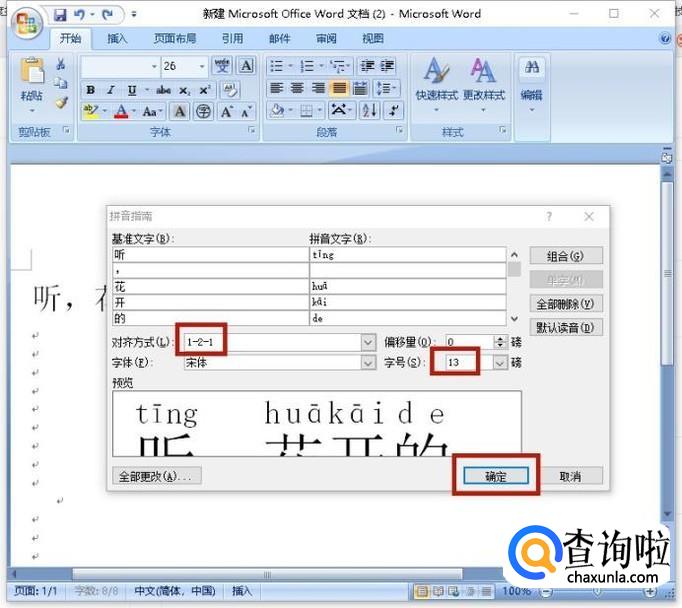 弹开“拼音指南”的对话框,设置合适的对齐方式、字体、字号、偏移量等,然后点击"确定“。