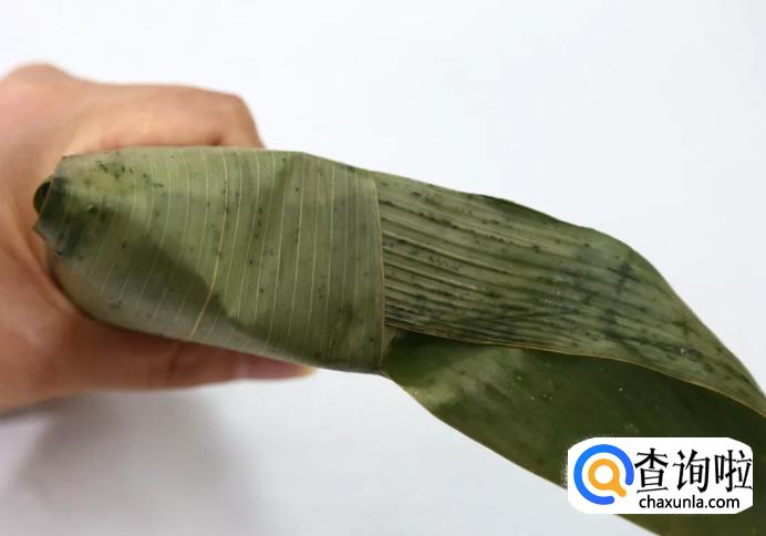在把另一片粽叶顺着之前的一片粽叶也包过来捏紧,这样两片叶子交叉包在一起,米就不容易漏出去,粽子也会包得非常的牢。