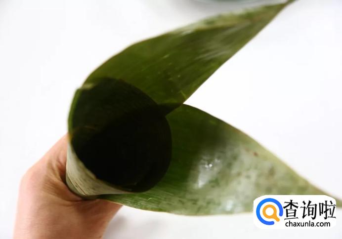 然后我们把粽叶折成一个漏斗型,把两片棕叶的尾部叠在一起,漏斗型的粽叶可以防止米漏下去。