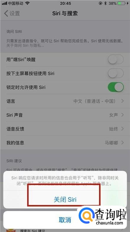 然后点击关闭Siri,如下图所示。