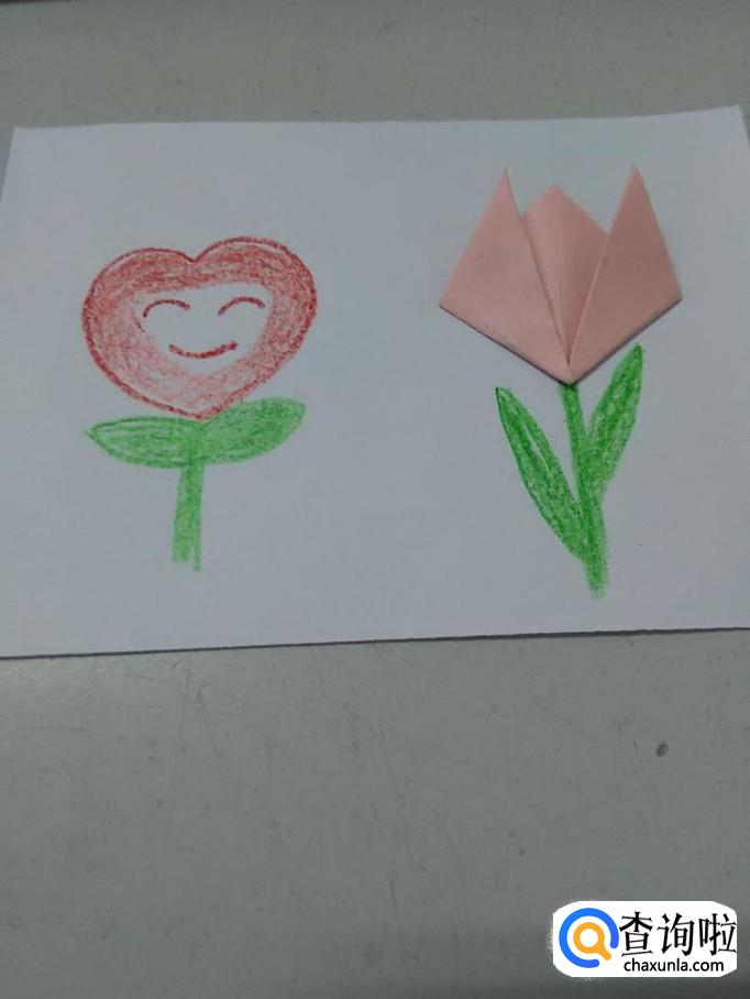 再用剪刀从白纸上剪下一个长方形,当作贺卡的背景,把郁金香用胶棒粘在白纸上。
