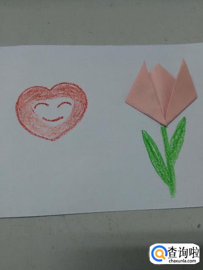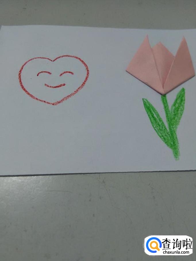 用红笔在花的左边画一个桃心,在桃心的上面画三条弧线,表示笑脸。