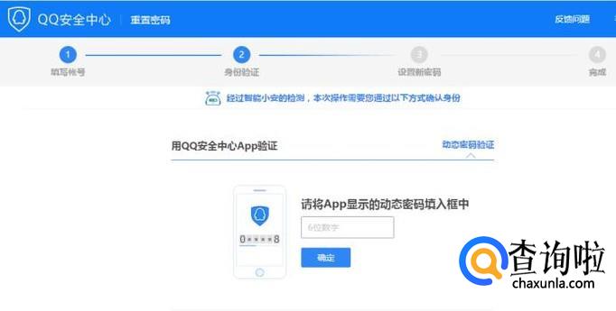 将手机QQ安全中心APP中的动态密码填写进输入框中,点击“确定”按钮。