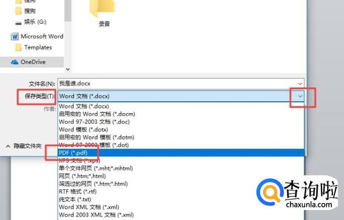 弹出的界面,我们点击保存类型边上的下拉箭头,然后我们找到PDF,然后点击选中它;