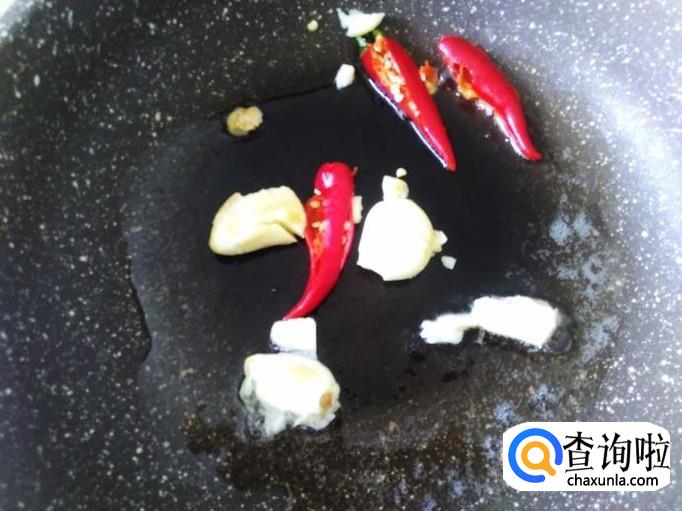 开火下油,放蒜米、小米辣进去爆香。