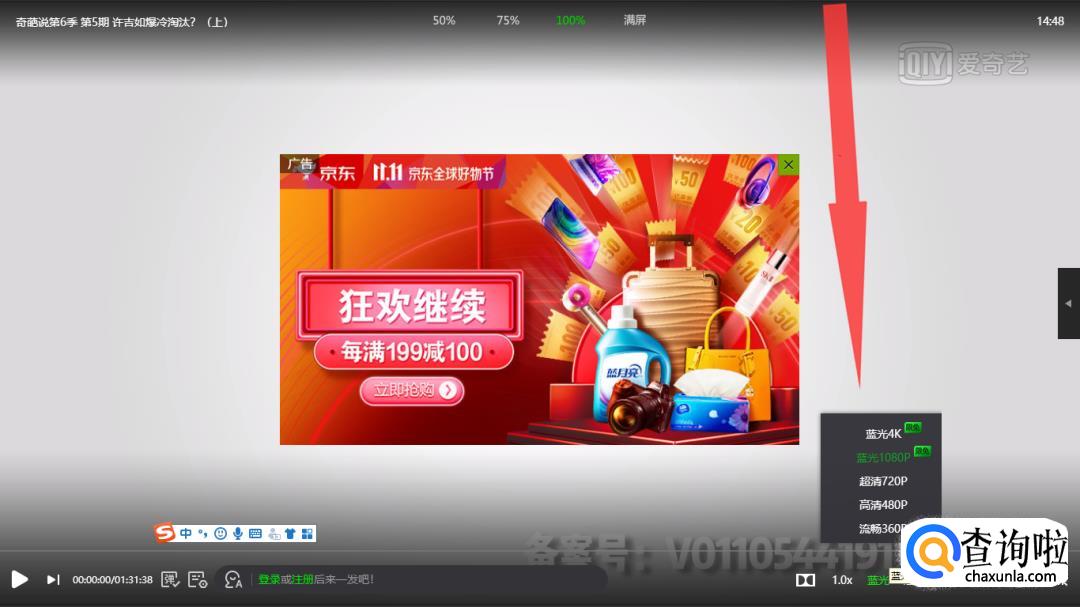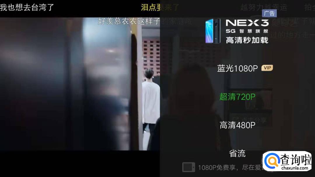 接着会弹出画质选择菜单,包括会员专属的蓝光1080P,超清、高清、流程、省流共计5项。