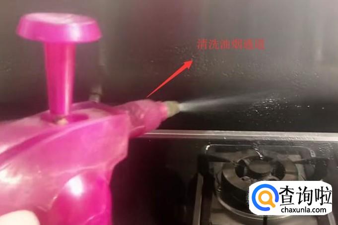 接下来需要在油烟通道喷洒清洁剂,然后用软棉擦清洗油烟通道,如下图所示