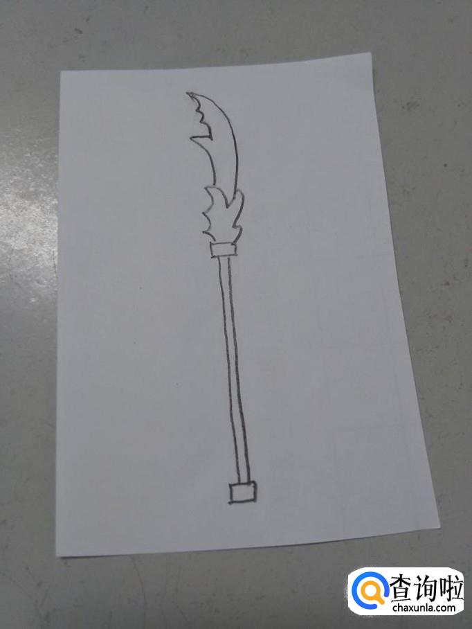 在长方形下面再画一个特别细长的长方形,表示青龙偃月刀的刀杆,在刀杆的下面再画一个小的长方形,表示青龙偃月刀的刀把,青龙偃月刀就画好了。