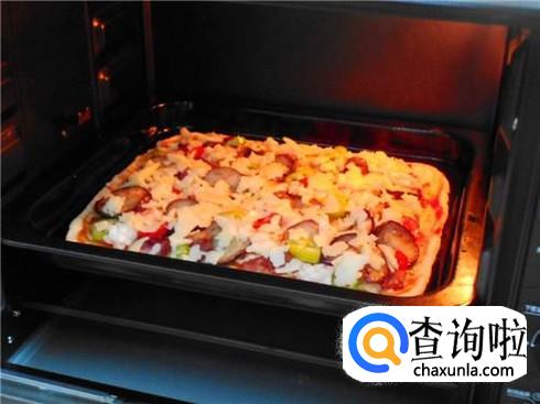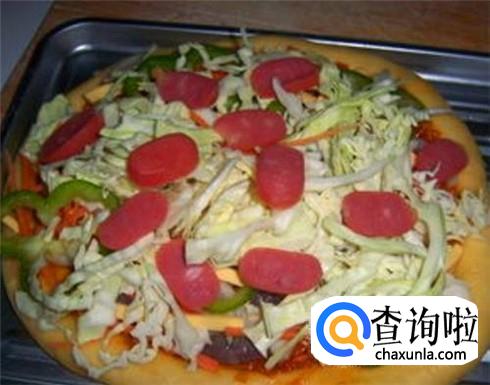 把一些芝士铺在面饼上,然后抹上一层披萨酱,再根据个人喜好放入青椒、洋葱、香肠,亦或是其他你喜欢的蔬菜都可以,然后在上面放一些奶酪,放进烤盘里。