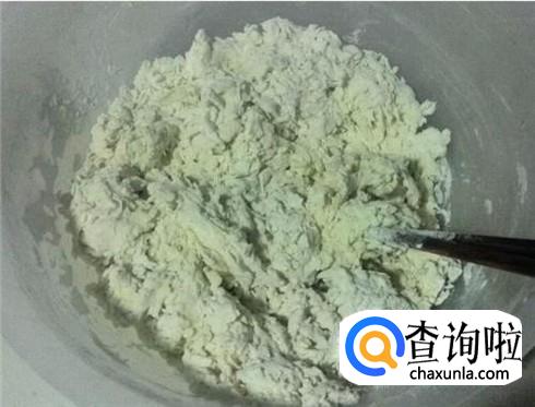 加上芝士粉、牛奶半盒、鸡蛋一到两个,然后加一点食盐倒入面粉,用温水化一些酵母,然后和成面团。