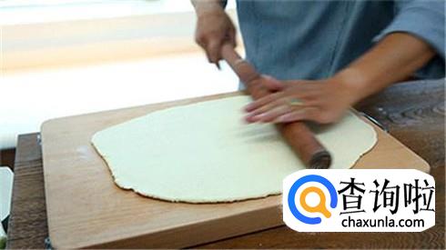 面团是一定要发酵的,用保鲜膜覆盖发酵大概一个小时后,面团发酵好了,取出来用擀面杖做成小薄饼的样子。