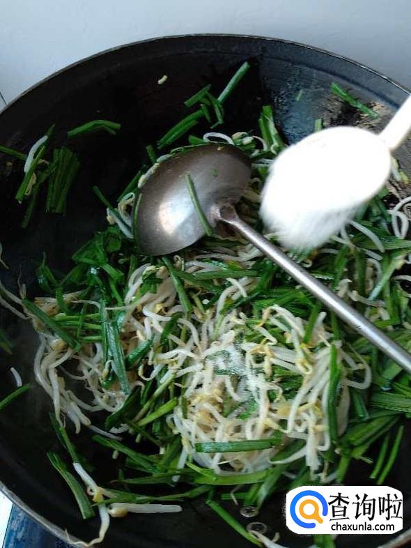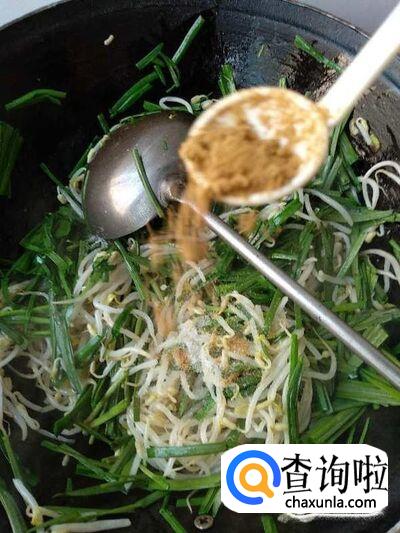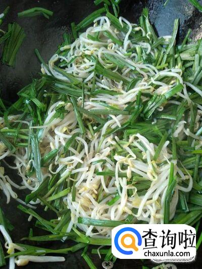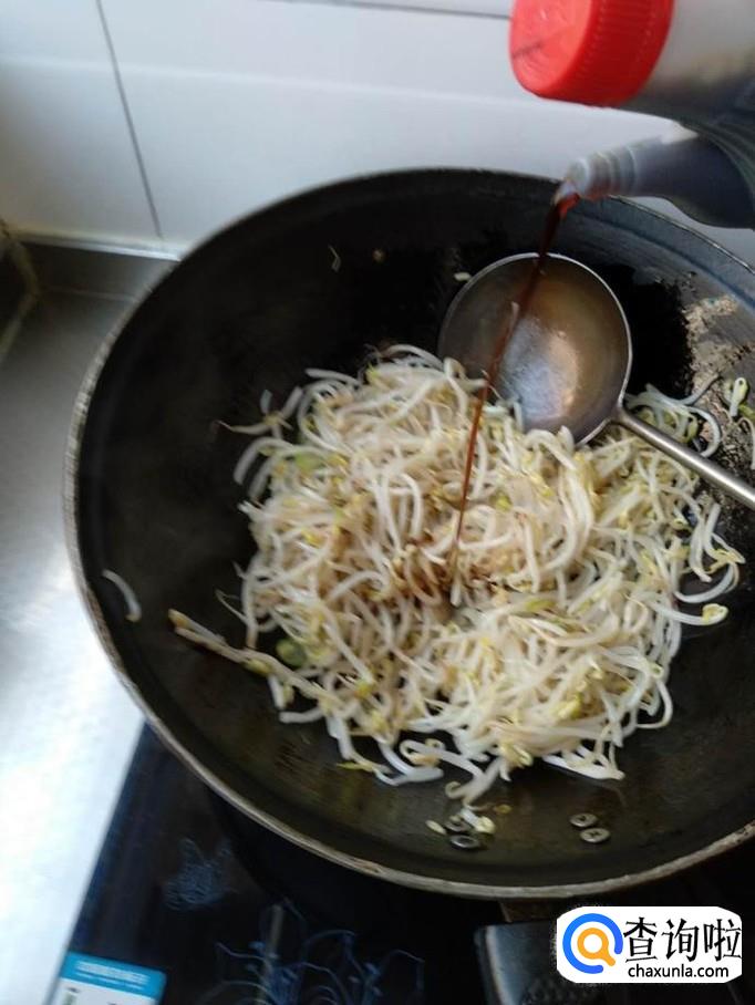 先倒入豆芽翻炒至豆芽微微发出金黄色。