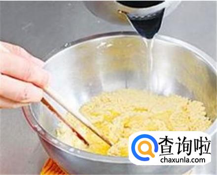 盆里放上适量玉米面,做红薯窝窝头的时候加上点玉米面是非常好吃的。一边往玉米面里到开水一边用筷子搅拌,让玉米面成絮状就可以了。