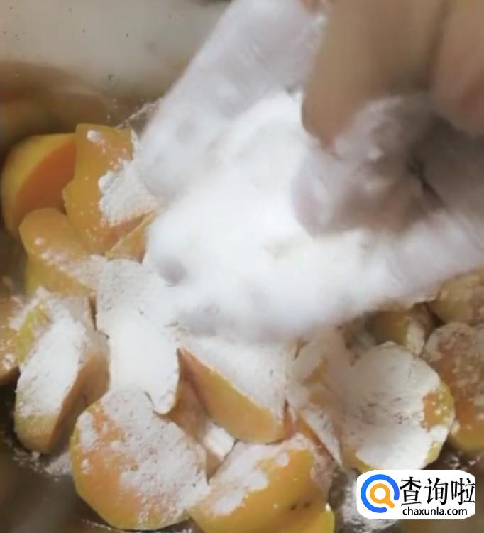 将准备好的淀粉撒上搅拌均匀,要保证每块红薯都均匀的粘上淀粉。