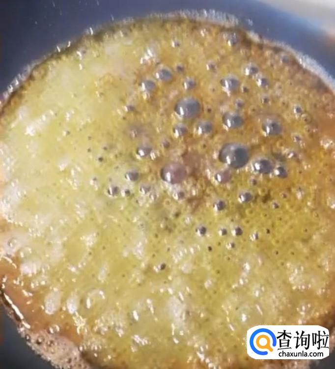 将糖和水熬成金黄色糖浆,也可以参考上面的泡,先是起大泡,随后变为小泡就差不多了。