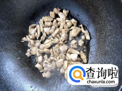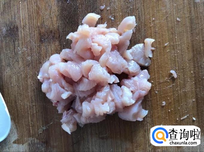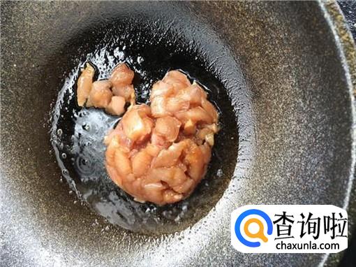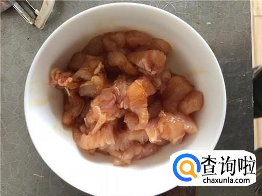 将腌制好的鸡胸脯,过油,炒至没有血丝即可,装出备用