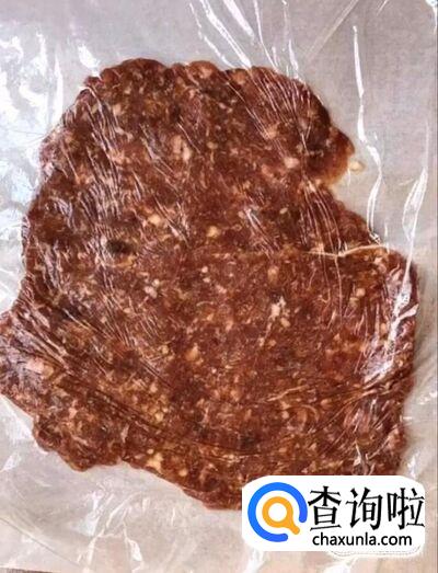 然后我们在桌子上铺一层吸油纸,放入搅拌好的肉馅,在上面铺一层保鲜膜,用擀面杖擀成一元硬币的厚度