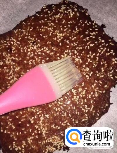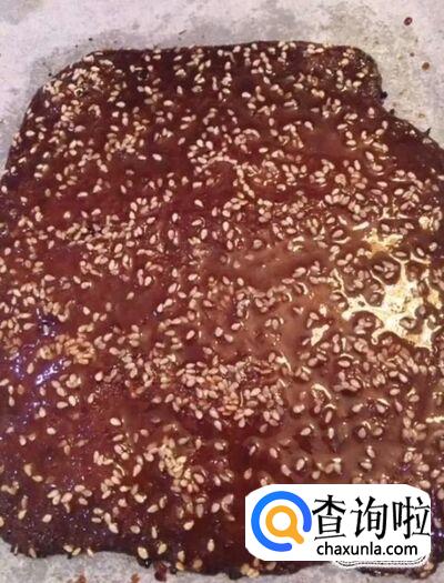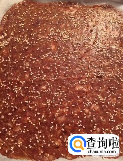 接着我们把烤箱预热五分钟,把擀好的肉馅撒上一层白芝麻,放入烤箱中,上下火,180度烤10分钟