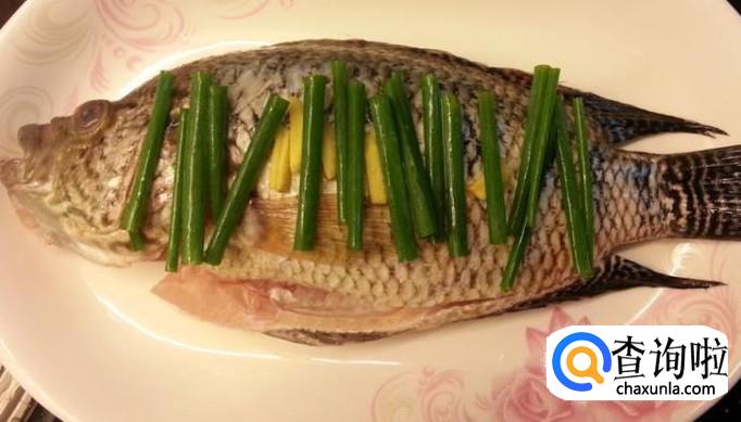把鱼摆在碟子,铺上姜丝香葱。