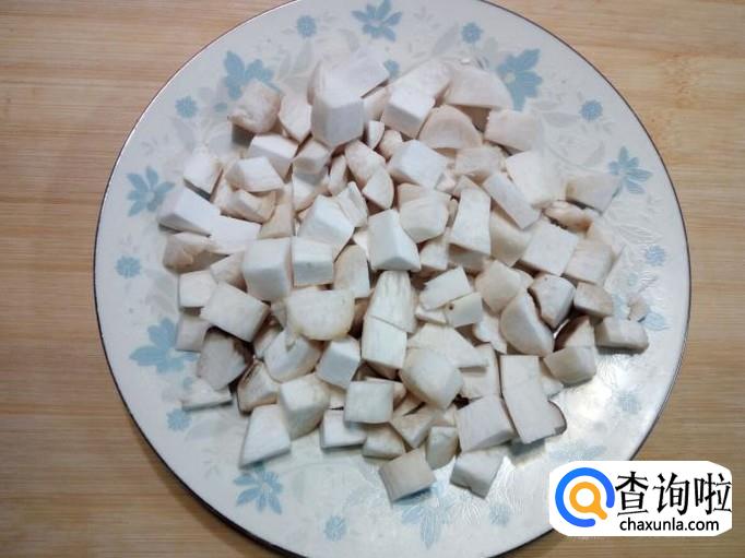 杏鲍菇用水清洗干净,控干水分,切成丁。