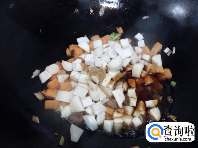 炒至胡萝卜变软,放入杏鲍菇翻炒,放入料酒,五香粉,两匙儿蚝油。炒至杏鲍菇变软,放入香芹翻炒,不用放盐。