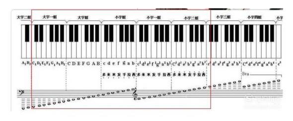 61键电子琴有6组琴键,其中从左边开始数第一到第五组是完整的,每组12个键,最右边一组不完整,只有一个C(即C调中的dol)键。这六组键,从左到右依次是大字组、小字组、小字一组、小字二组、小字三组、小字四组。 从大字组最左边的键开始,白键依次是C,D,E,F,G,A,B,对应C调中的1,2,3,4,5,6,7。至于黑键,是将起左边的白键升高半个音或将右边的白键降低半个音。