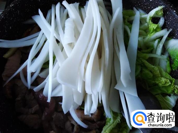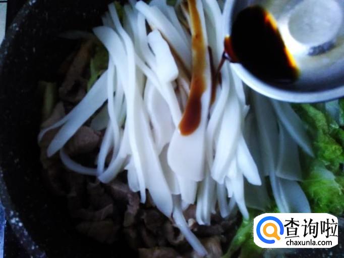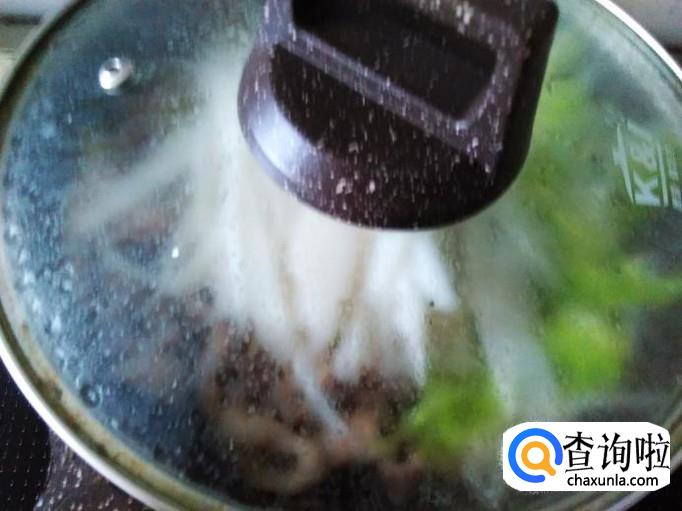 粉利铺在菜面上,盖上盖子焗3分钟。【粉利放在菜面焗软,炒的时候就不会断碎】