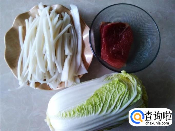 粉利150克,瘦肉100克,娃娃菜100克,姜蓉、蒜米适量,生抽适量。