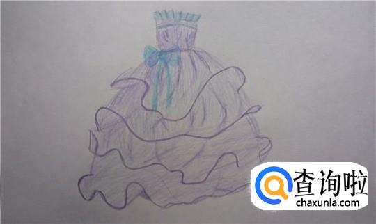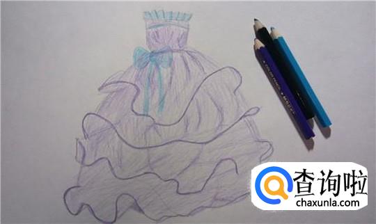 最后给公主裙上身的花边涂上蓝色,再在腰处画一个蓝色的蝴蝶结,这样公主裙是不是更好看了呢?