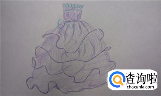 用紫色彩铅跟着刚刚画出的公主裙描一遍,这里下笔要重一些,突出裙摆飞舞的感觉。