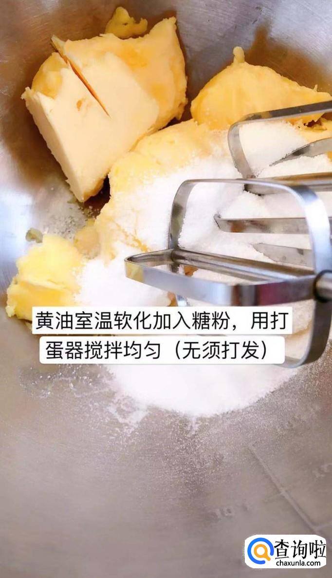 然后将黄油在室温软化加入糖粉,用打蛋器搅拌均匀,如下图所示。