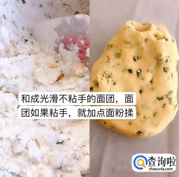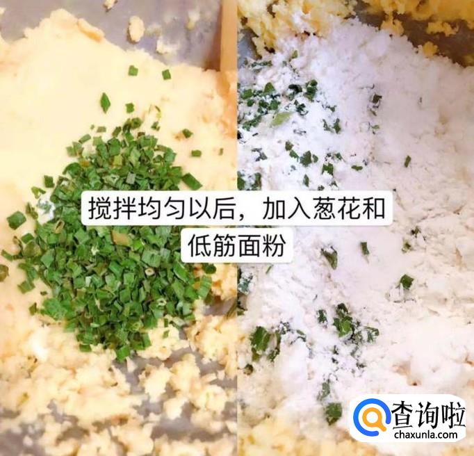 搅拌均匀以后,加入葱花和低筋面粉,如下图所示。