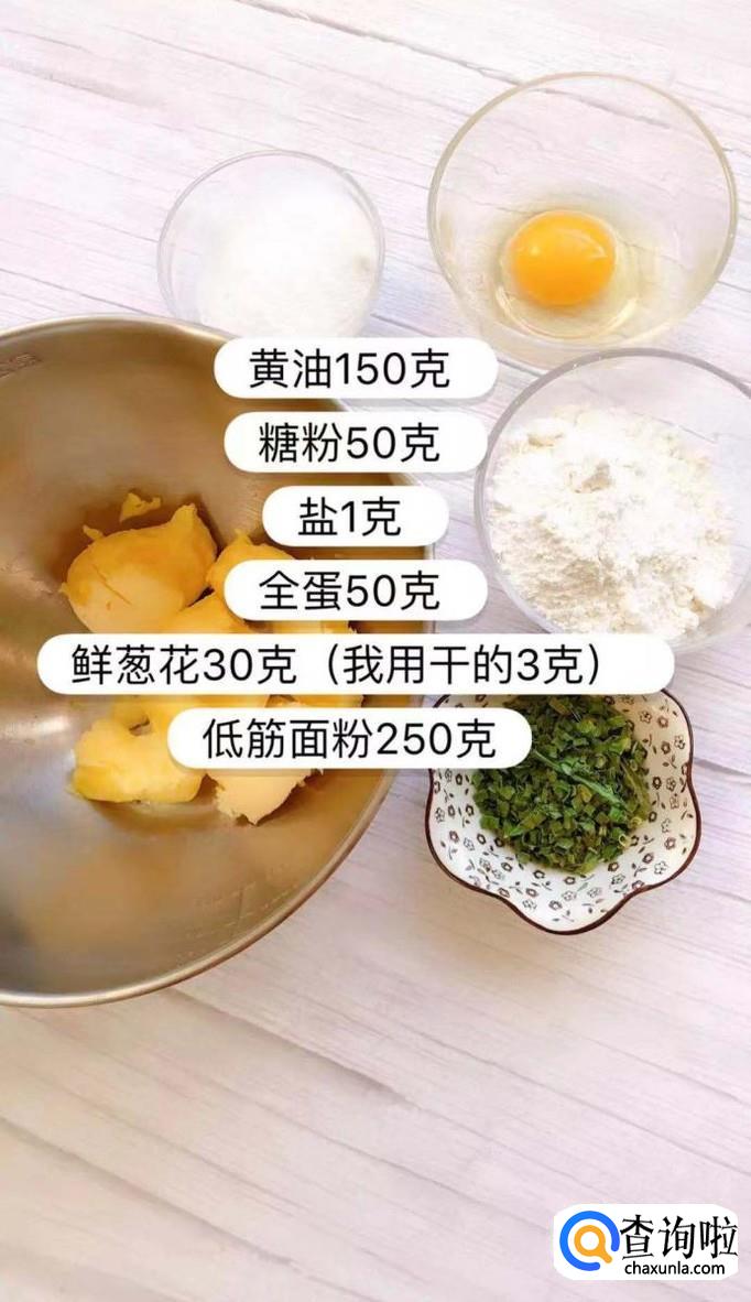首先准备好要用到的所有食材,如下图所示。小贴士:黄油150克,糖粉50克,盐1克,鸡蛋50克,鲜葱花30克,低筋面粉250克。