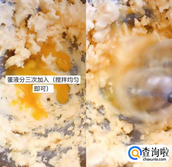 接着将蛋液分三次加入,搅拌均匀就可以了。