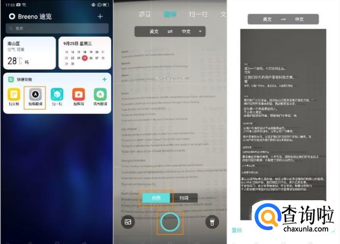 这里以【拍照翻译】为例,看到有英文不认识,直接点击负一屏的【拍照翻译】进入以下界面—点击【拍照】,即可知道相应的英文含义