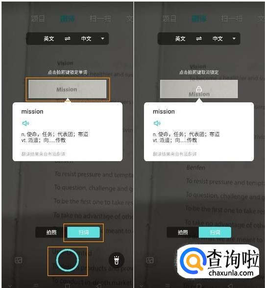 如果只是单个的单词不认识,可以点击【扫词】,对准相应的词后点击拍照键进行锁定即可。
