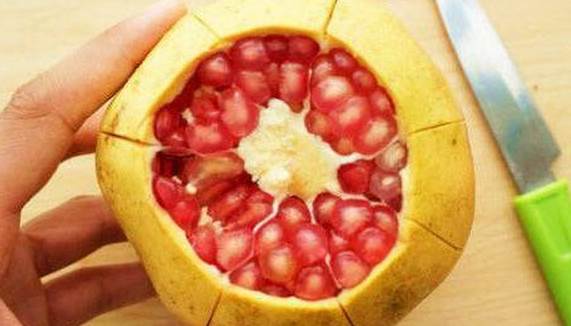 在石榴的顶端横切一刀,去顶,用刀顺着石榴的白筋在外皮上划几刀。刀口不要太深,划开石榴皮就行了。用刀尖轻轻把中间白色部份的内心划断,抽掉中间的白心,轻轻一掰,石榴就“开花”了,这个时候,很容易就能取出石榴籽。