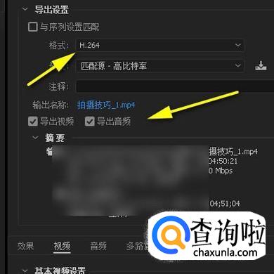 接着,按下CTRL+M,调出导出面板。设置其格式为:H.264;并且要记得把视频与音频都一并勾选上,再点导出。
