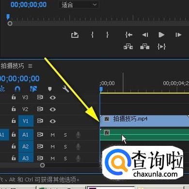 鼠标点住此音乐文件,直接拖拉到序列面板的音频轨道1这里。