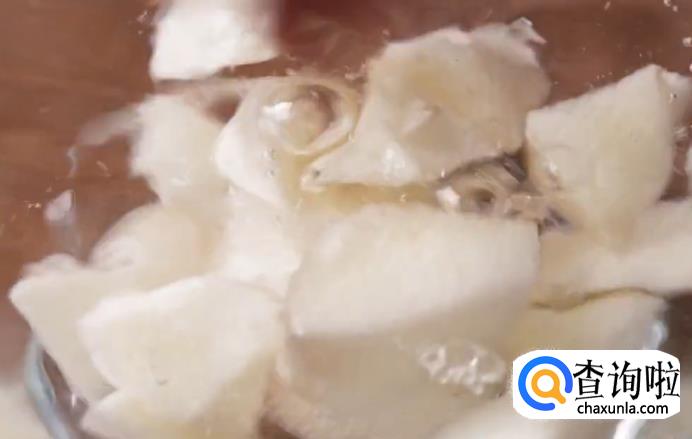 之后把削过皮的山药切滚刀块,然后放入加盐的水中浸泡防止氧化变色。