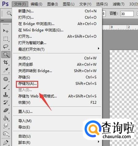 得到透明背景图片之后,在文件菜单那里找到存储为选项,如图所示: