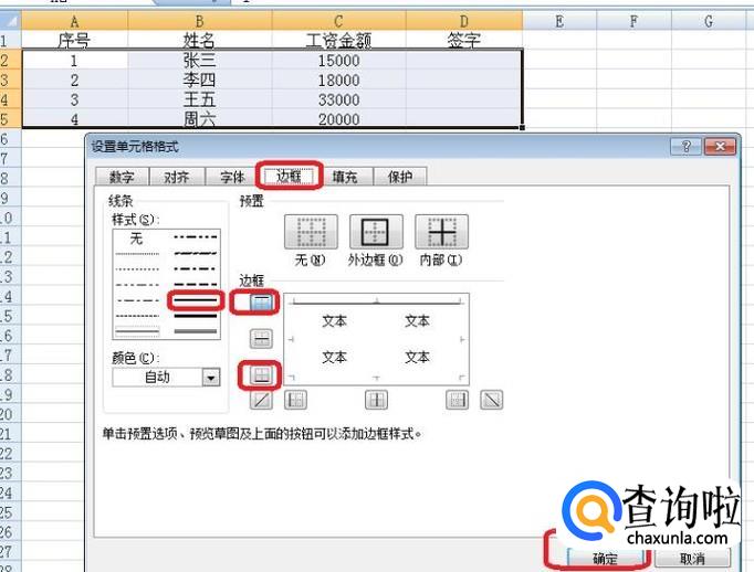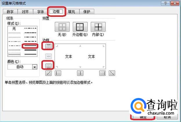 出现选项框,我们点击“边框”标签,然后只选中上框线和下框线,选择一种线条样式,点击确定。