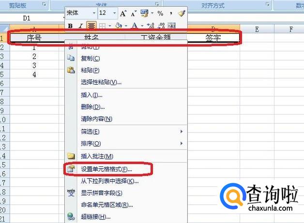 用鼠标选中标题行全部内容,右键点击,选择“设置单元格格式”。