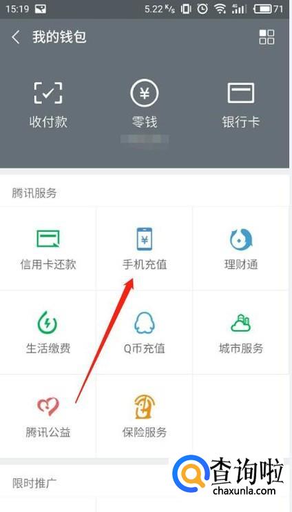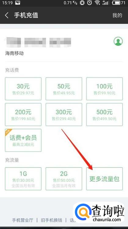 进入钱包后,我们点击“手机充值”然后下拉,我们会看到有流量包的充值,我们点击“更多流量包”进入。